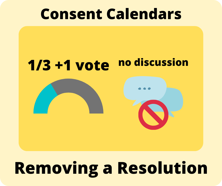 That’s where the fun starts! An resolution may be removed from the consent calendar any time before the final vote, but there are specific ways of doing it (don’t we love rules?). A resolution may only be removed from the Consent Calendar by a vote of the House, the Committee on Dispatch of Business or by the President.